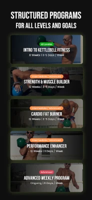 Aplikasi ini menyediakan pelbagai program terstruktur yang sesuai untuk setiap peringkat. Mulakan dengan Program Permulaan selama 8 minggu, 3 hari seminggu, direka untuk membina asas yang kukuh, keyakinan, dan teknik yang betul. Bagi mereka yang mencari cabaran lebih, pilih antara Program Pembakar Lemak HIIT untuk meningkatkan metabolisme, atau Program Kekuatan & Pembinaan Otot untuk peningkatan jisim yang serius. Untuk atlet yang lebih mahir, Program Dinamik Lanjutan menawarkan enam senaman segar setiap minggu—meliputi Senaman Seluruh Badan, Tarik + Tolak, Kaki, Kompleks, dan Kondisi. Setiap senaman dilengkapi dengan pemasa pintar dan panduan ikut-serta, manakala perpustakaan senaman yang luas menyediakan demo video serta tip pakar untuk memastikan anda sentiasa berada di landasan yang betul. Mod "Untuk Permulaan" juga boleh diaktifkan dalam tetapan untuk pilihan senaman yang lebih ringkas.