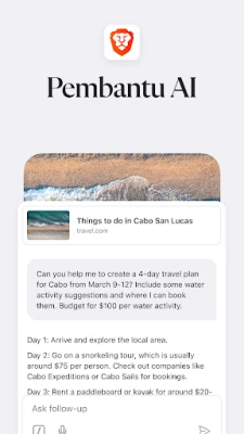 Pelayar Laman Sesawang Brave ialah pelayar web peribadi yang menyekat iklan pihak ketiga, percuma. Lebih 100 juta pengguna memilih Brave untuk ciri seperti pembantu AI Brave Leo, Firewall + VPN, dan penyekat iklan, menjamin privasi anda.