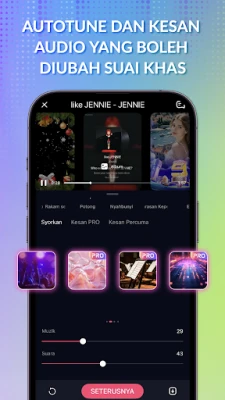 Dengan StarMaker, anda mempunyai akses kepada perpustakaan karaoke yang luas, merangkumi berjuta-juta lagu hit tempatan dan antarabangsa dari pelbagai genre seperti Pop, Hip Hop, R&B, atau Folk. Nyanyi bersama iringan muzik berkualiti studio dan lirik yang bergolek selaras. Sesuaikan persembahan vokal anda dengan pelbagai kesan suara yang unik seperti Jauh, Hangat, atau Pesta, serta sentuhan visual dengan penapis video estetik seperti Vintage atau Urban. Gunakan pembetulan Pitch kami untuk menggilap suara anda seperti seorang profesional. Untuk sentuhan peribadi, manfaatkan fungsi 'Hook' untuk menyanyikan bahagian paling menarik dari lagu kegemaran anda, memastikan setiap persembahan meninggalkan kesan mendalam. Sedia untuk menawan hati? Kongsi rakaman karya agung anda dengan mudah ke platform sosial dan biarkan dunia terpukau!