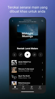 Rasai keajaiban muzik yang disesuaikan khas untuk setiap detik hidup anda. YouTube Music mencipta senarai main dan adunan semula diperibadikan berdasarkan jenis muzik kegemaran anda, malah menyediakan adunan semula aktiviti spesifik untuk sesi senaman, relaksasi, atau fokus anda. Anda juga boleh berkreatif dengan membina senarai main sendiri menggunakan cadangan lagu pintar, atau bekerjasama dengan rakan peminat muzik untuk menyusun koleksi sempurna. Pustaka diperibadikan anda menyimpan semua lagu, artis, album, dan senarai main yang anda suka dan telah tambahkan, semuanya dalam satu tempat yang mudah diakses.